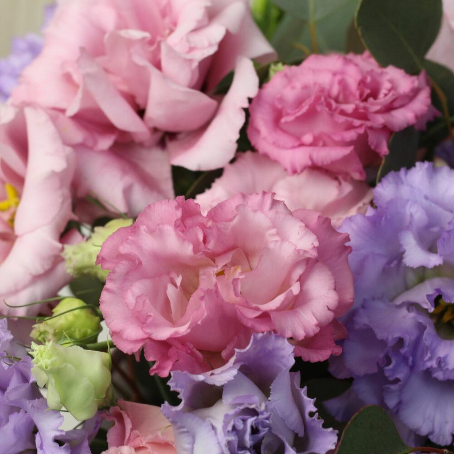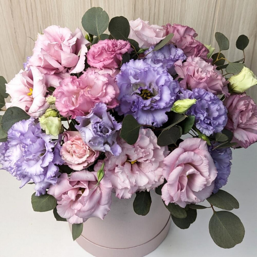 Букет из 15 розовых и сиреневых эустом в коробке в Джанкое