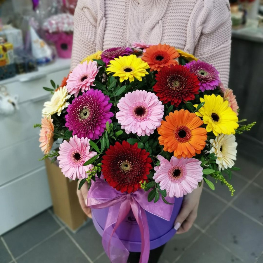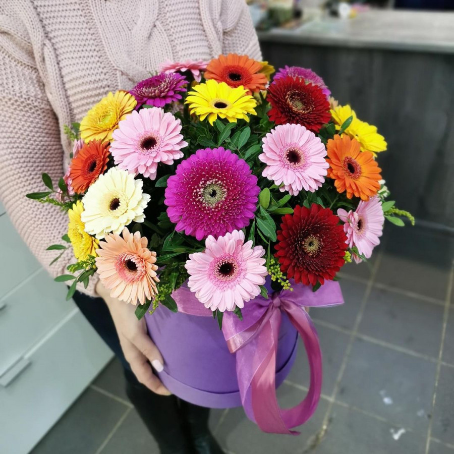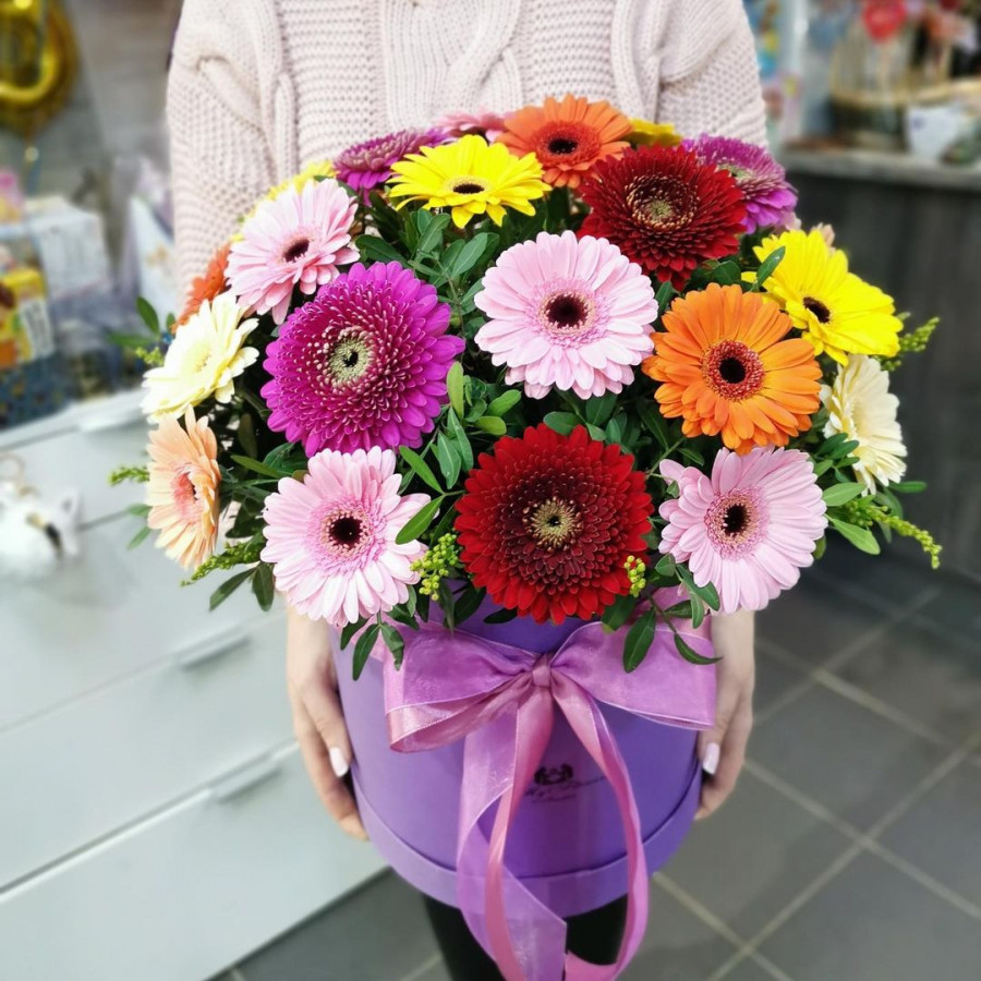 21 разноцветная гербера в шляпной коробке в Джанкое