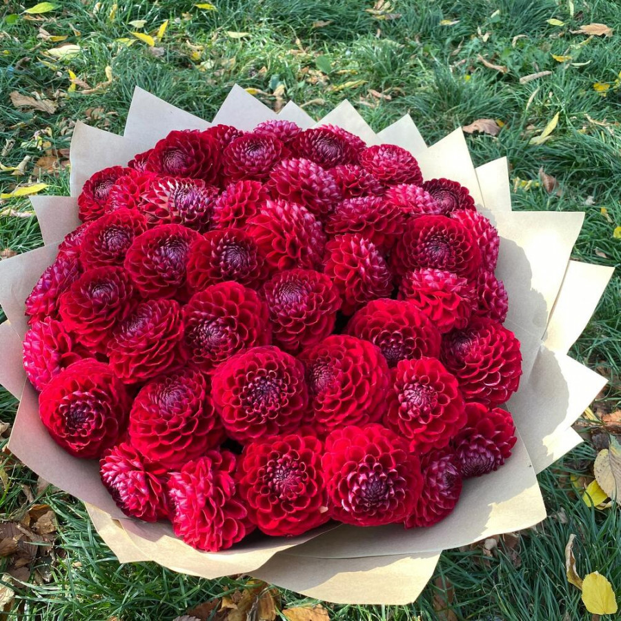 На фото букет из 49 красных георгин. В составе: георгина 49 шт, фоамиран 3 шт, атласная лента 2 шт, . Все цветы свежие и ароматные, букет красиво оформлен и отлично подходит для подарка. Доступна доставка цветов или самовывоз.