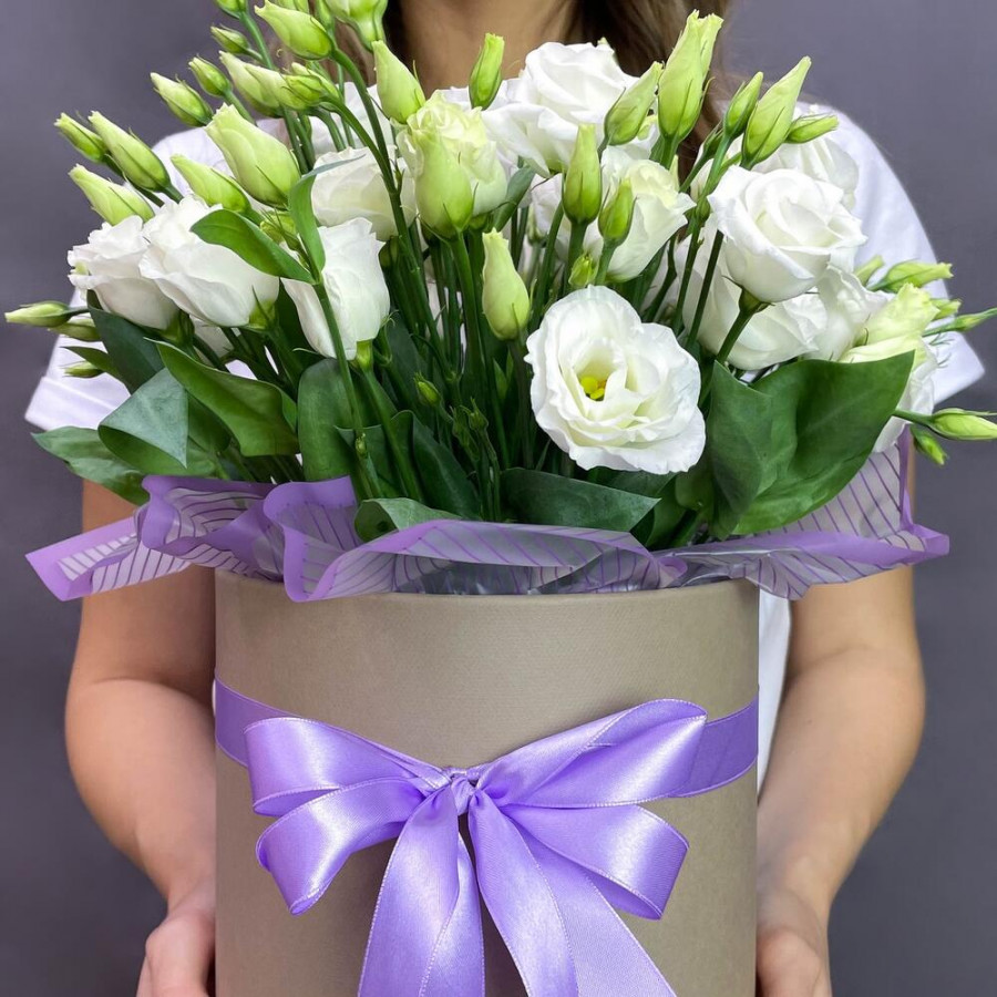 На фото букет из 7 белых эустом в коробке. В составе: эустома (лизиантус) 7 шт, оазис флористический 1 шт, коробка (m) 1 шт, атласная лента 2 шт, . Все цветы свежие и ароматные, букет красиво оформлен и отлично подходит для подарка. Доступна доставка цветов или самовывоз.