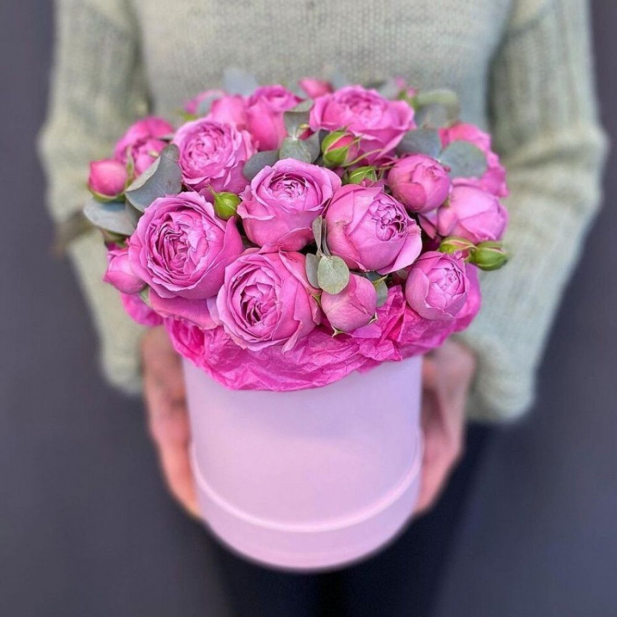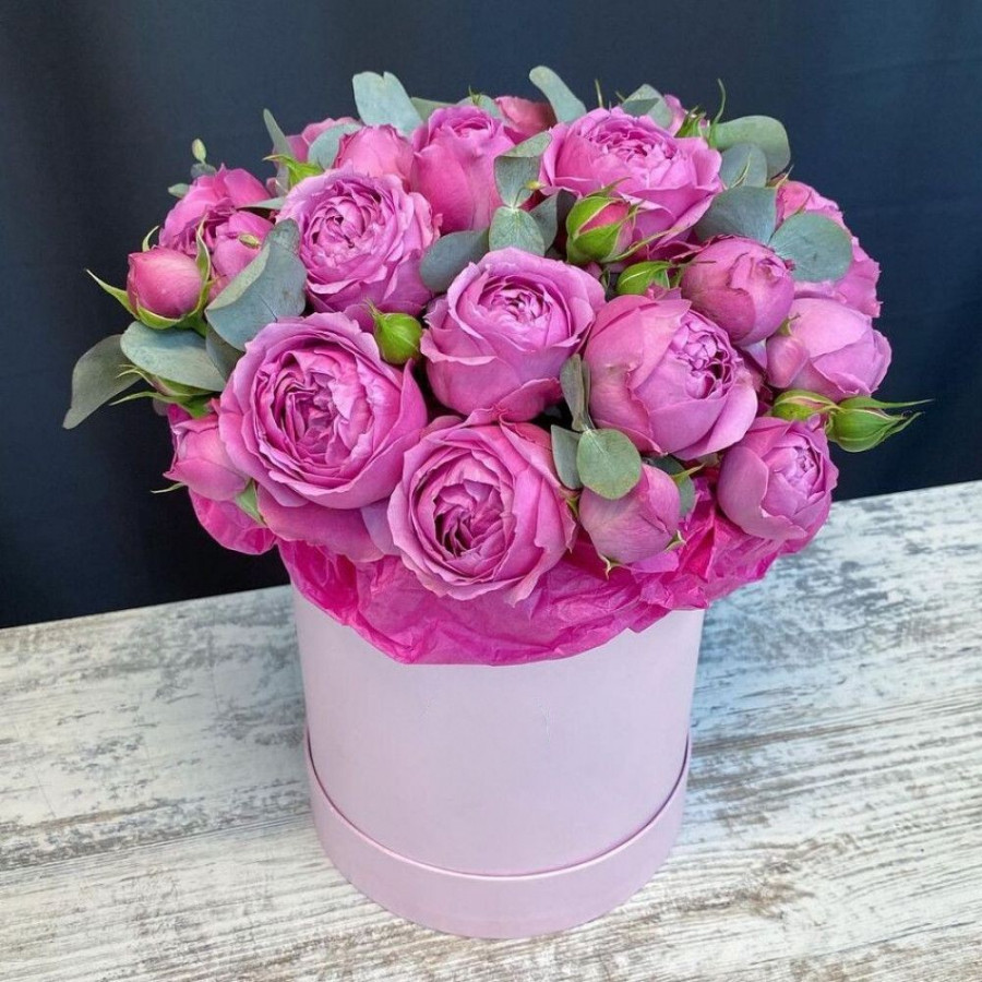 7 розовых кустовых пионовидных роз в шляпной коробке