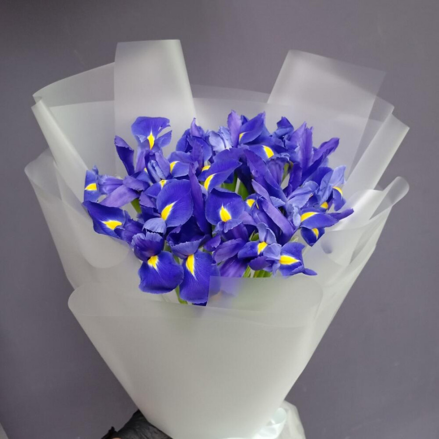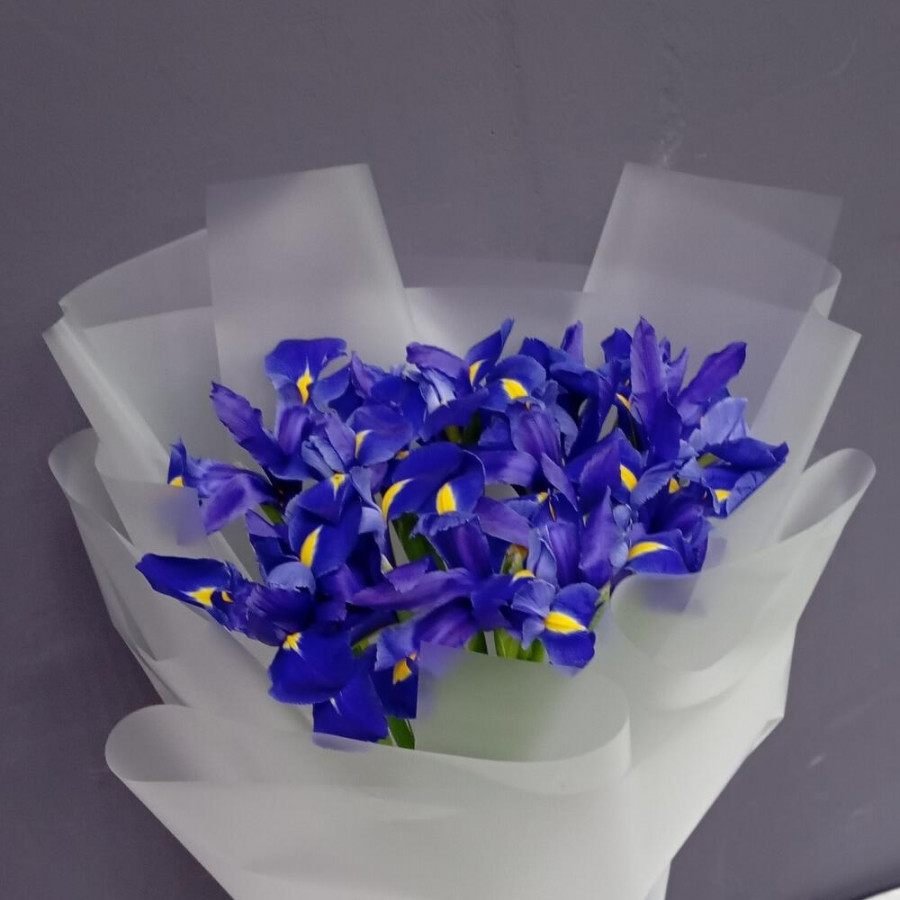 На фото букет из 9 синих ирисов. В составе: ирис 9 шт, дизайнерская упаковка 1 шт, атласная лента 1 шт, . Все цветы свежие и ароматные, букет красиво оформлен и отлично подходит для подарка. Доступна доставка цветов или самовывоз.