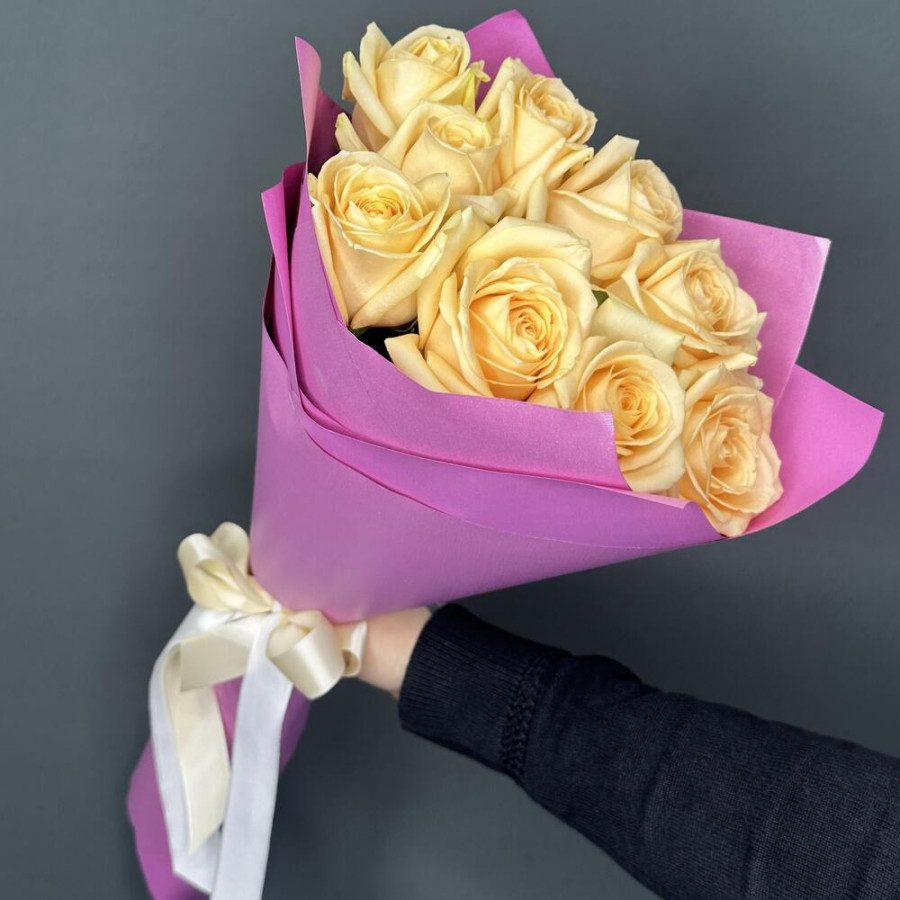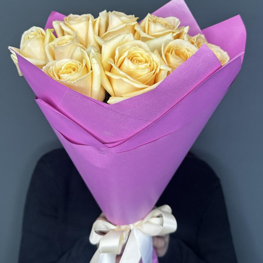 На фото букет из 9 кремовых роз. В составе: роза 9 шт, фоамиран 2 шт, атласная лента 1 шт, . Все цветы свежие и ароматные, букет красиво оформлен и отлично подходит для подарка. Доступна доставка цветов или самовывоз.