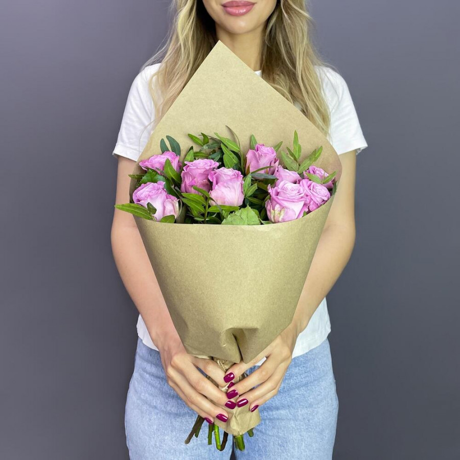 На фото букет из 9 сиреневых роз. В составе: роза 9 шт, писташ 3 шт, крафт-бумага 1 шт, атласная лента 1 шт, . Все цветы свежие и ароматные, букет красиво оформлен и отлично подходит для подарка. Доступна доставка цветов или самовывоз.