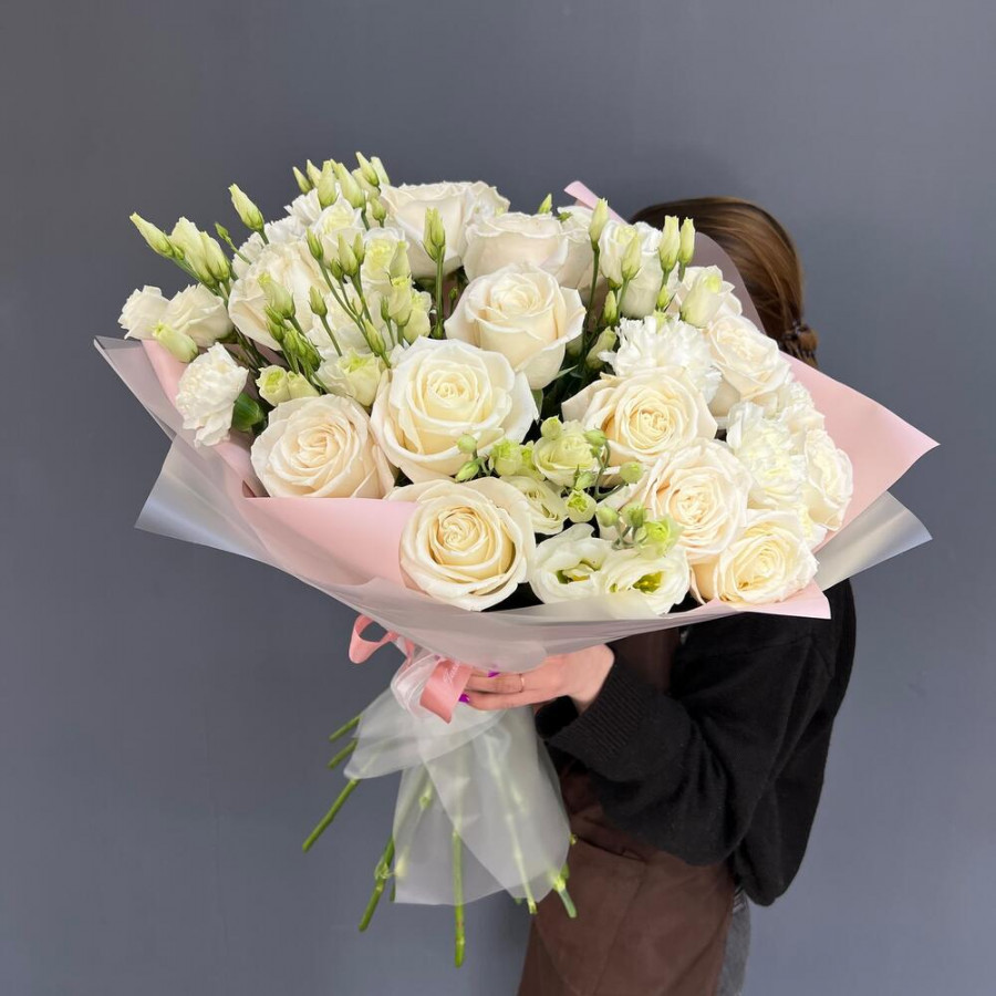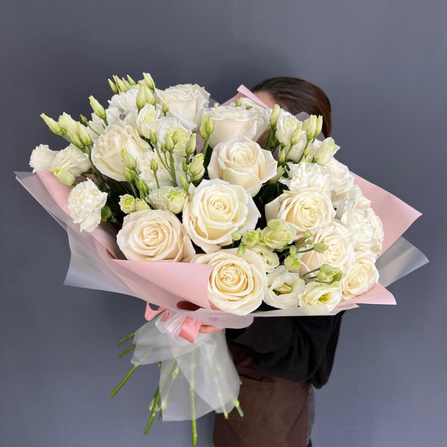 На фото букет «белый рассвет». В составе: роза 15 шт, эустома (лизиантус) 10 шт, дизайнерская упаковка 1 шт, атласная лента 1 шт, . Все цветы свежие и ароматные, букет красиво оформлен и отлично подходит для подарка. Доступна доставка цветов или самовывоз.