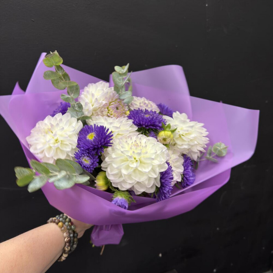 На фото букет из георгинов и астр. В составе: георгина 7 шт, астра 6 шт, эвкалипт 4 шт, дизайнерская упаковка 1 шт, атласная лента 1 шт, . Все цветы свежие и ароматные, букет красиво оформлен и отлично подходит для подарка. Доступна доставка цветов или самовывоз.