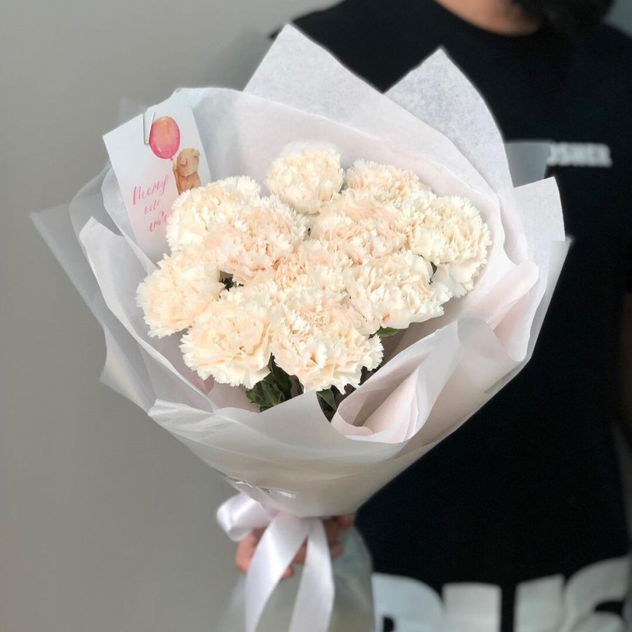 Букет из 11 белых гвоздик - это символ чистоты, нежности и элегантности. Эти цветы олицетворяют красоту и изысканность, а также являются символом любви и уважения. Букет из белых гвоздик идеально подойдет для любого повода, будь то день рождения, юбилей, свадьба или просто романтический ужин.