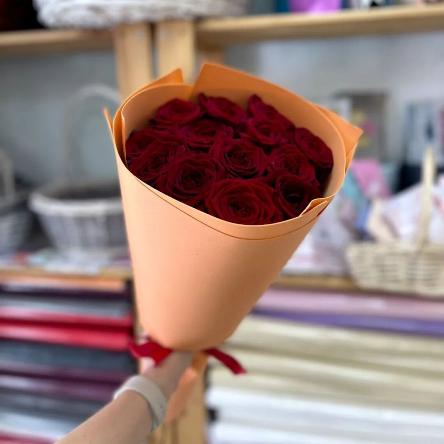 На фото букет из 13 красных роз. В составе: роза 13 шт, крафт-бумага 1 шт, атласная лента 1 шт, . Все цветы свежие и ароматные, букет красиво оформлен и отлично подходит для подарка. Доступна доставка цветов или самовывоз.