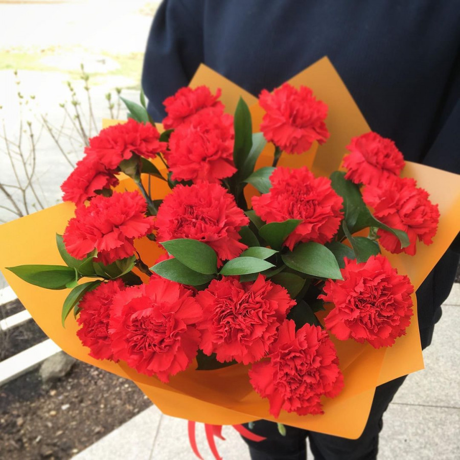 На фото букет из 15 красных гвоздик. В составе: гвоздика 15 шт, крафт-бумага 1 шт, атласная лента 1 шт, . Все цветы свежие и ароматные, букет красиво оформлен и отлично подходит для подарка. Доступна доставка цветов или самовывоз.