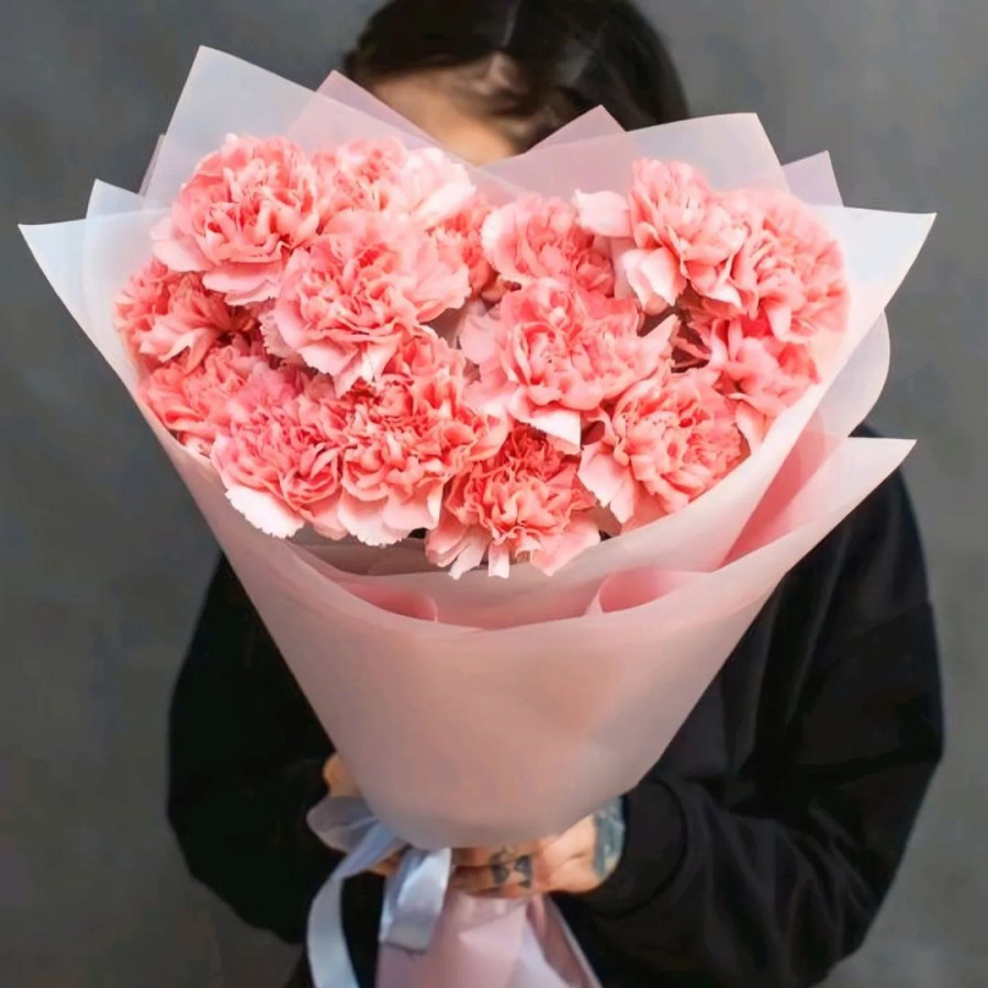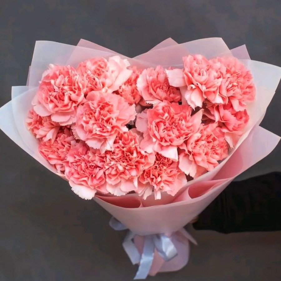 На фото букет из 15 розовых гвоздик. В составе: гвоздика 15 шт, крафт-бумага 1 шт, атласная лента 1 шт, . Все цветы свежие и ароматные, букет красиво оформлен и отлично подходит для подарка. Доступна доставка цветов или самовывоз.