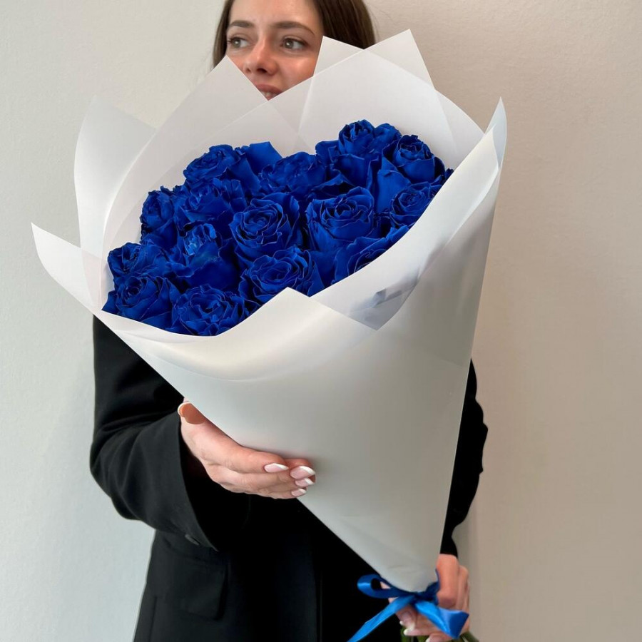 На фото букет из 15 синих роз. В составе: роза (синяя) 15 шт, дизайнерская упаковка 1 шт, атласная лента 1 шт, . Все цветы свежие и ароматные, букет красиво оформлен и отлично подходит для подарка. Доступна доставка цветов или самовывоз.