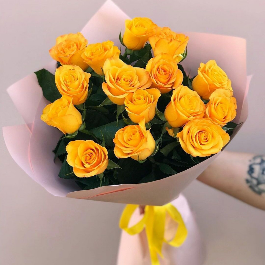 На фото букет из 15 желтых роз. В составе: роза 15 шт, крафт-бумага 1 шт, вибирнум 1 шт, . Все цветы свежие и ароматные, букет красиво оформлен и отлично подходит для подарка. Доступна доставка цветов или самовывоз.