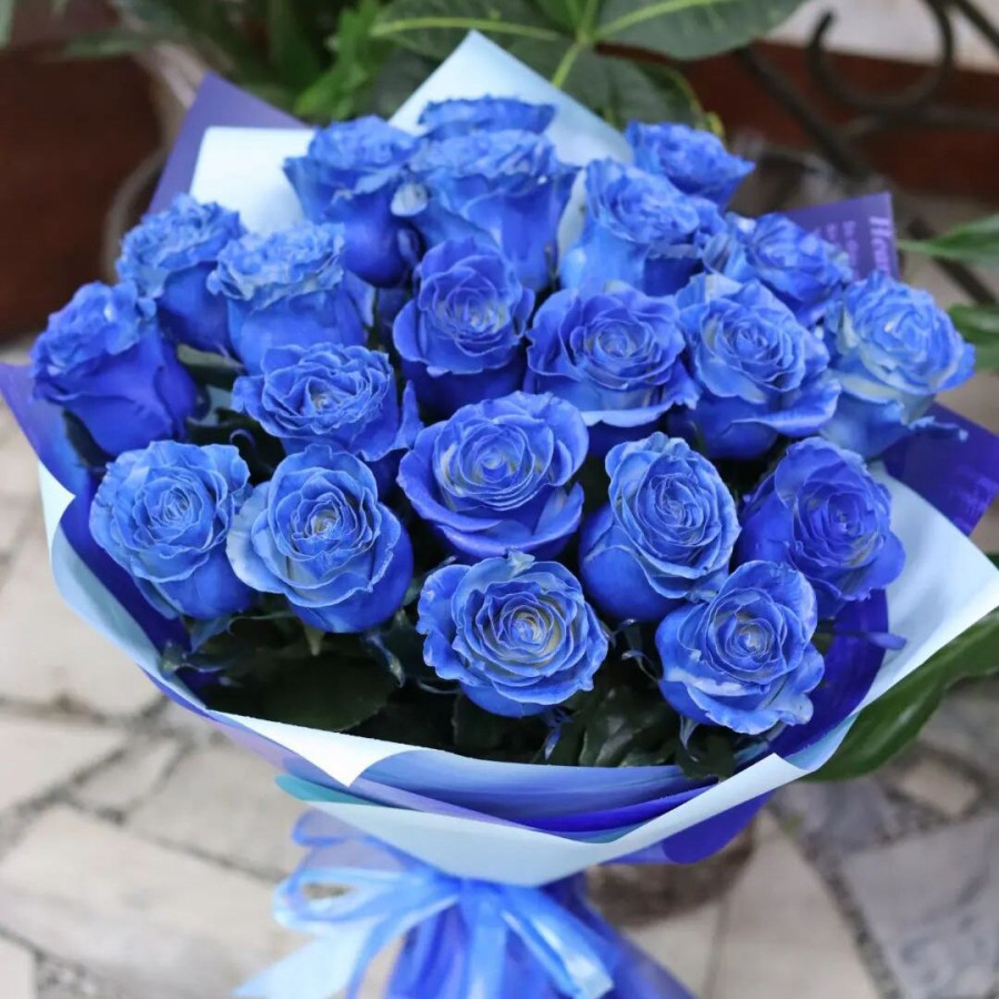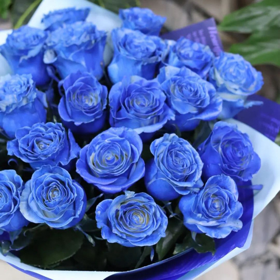 На фото букет из 21 синей розы. В составе: роза (синяя) 21 шт, крафт-бумага 1 шт, атласная лента 1 шт, . Все цветы свежие и ароматные, букет красиво оформлен и отлично подходит для подарка. Доступна доставка цветов или самовывоз.