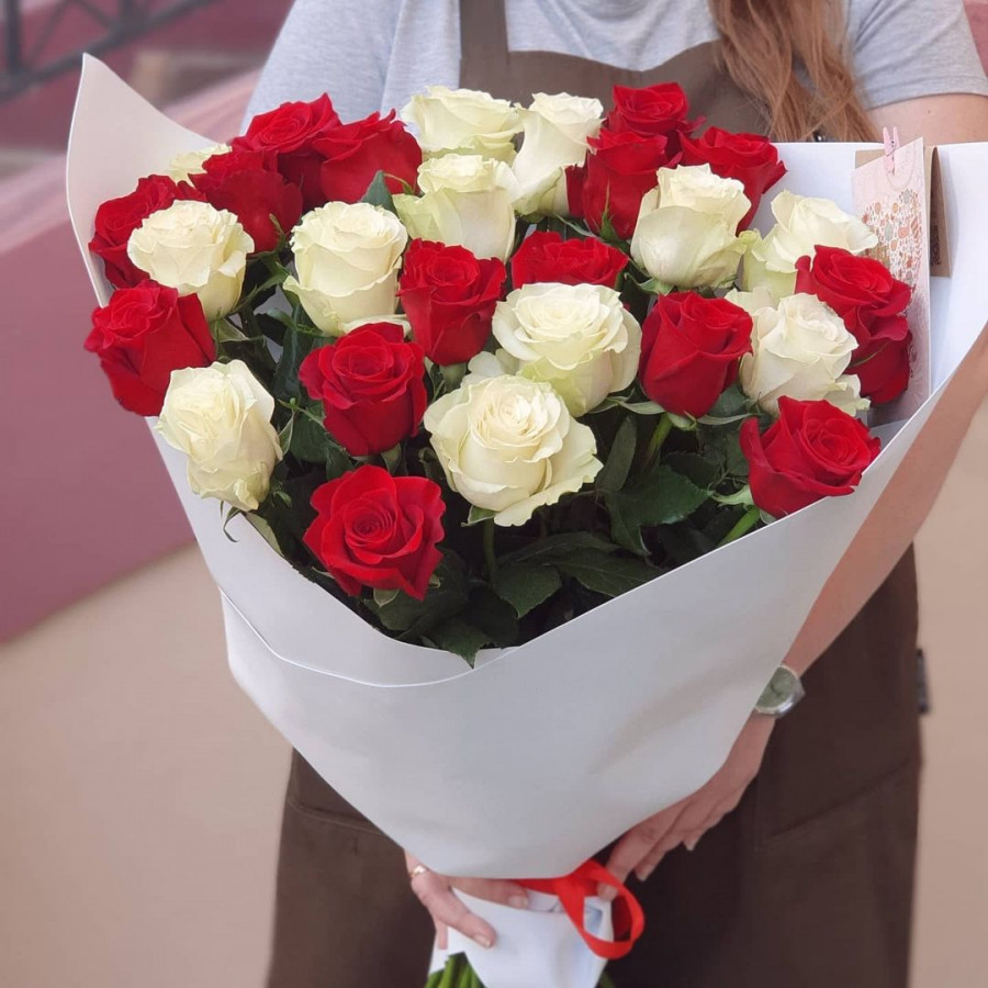 На фото букет из 27 белых и красных роз. В составе: роза 27 шт, крафт-бумага 1 шт, атласная лента 1 шт, . Все цветы свежие и ароматные, букет красиво оформлен и отлично подходит для подарка. Доступна доставка цветов или самовывоз.