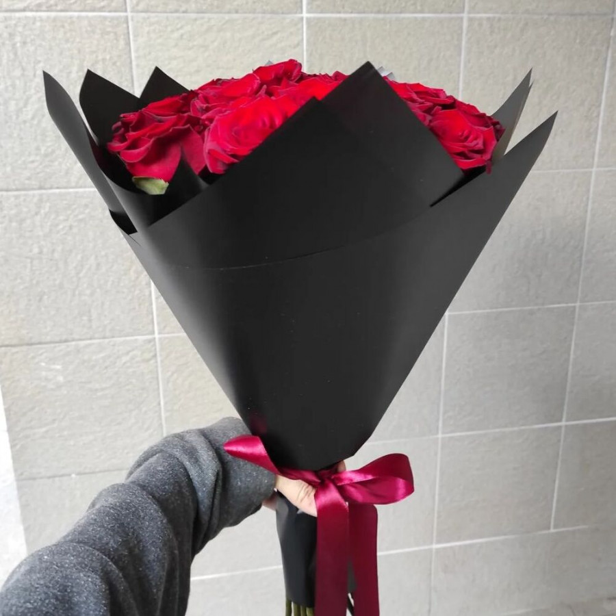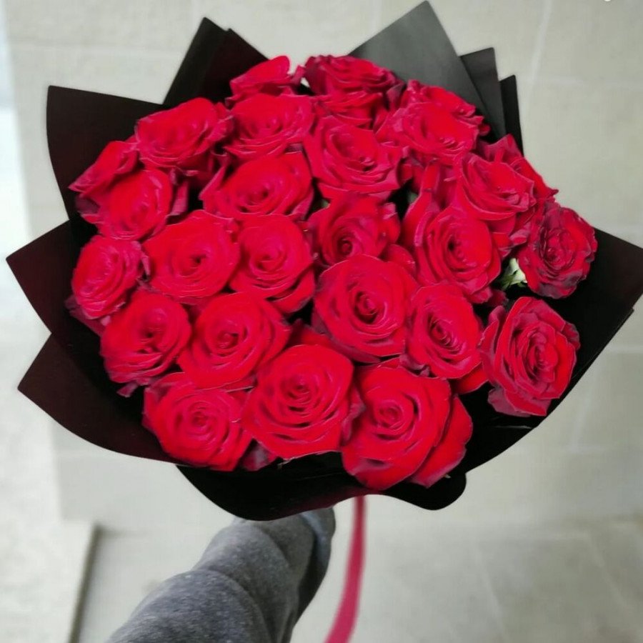 На фото букет из 27 красных роз. В составе: роза 27 шт, крафт-бумага 1 шт, атласная лента 1 шт, . Все цветы свежие и ароматные, букет красиво оформлен и отлично подходит для подарка. Доступна доставка цветов или самовывоз.