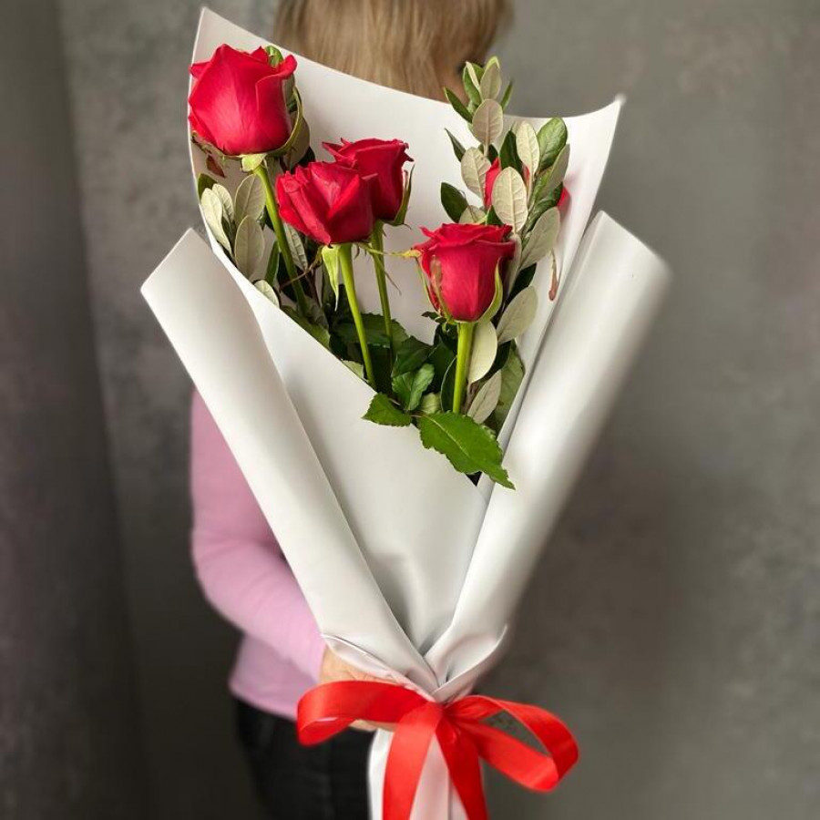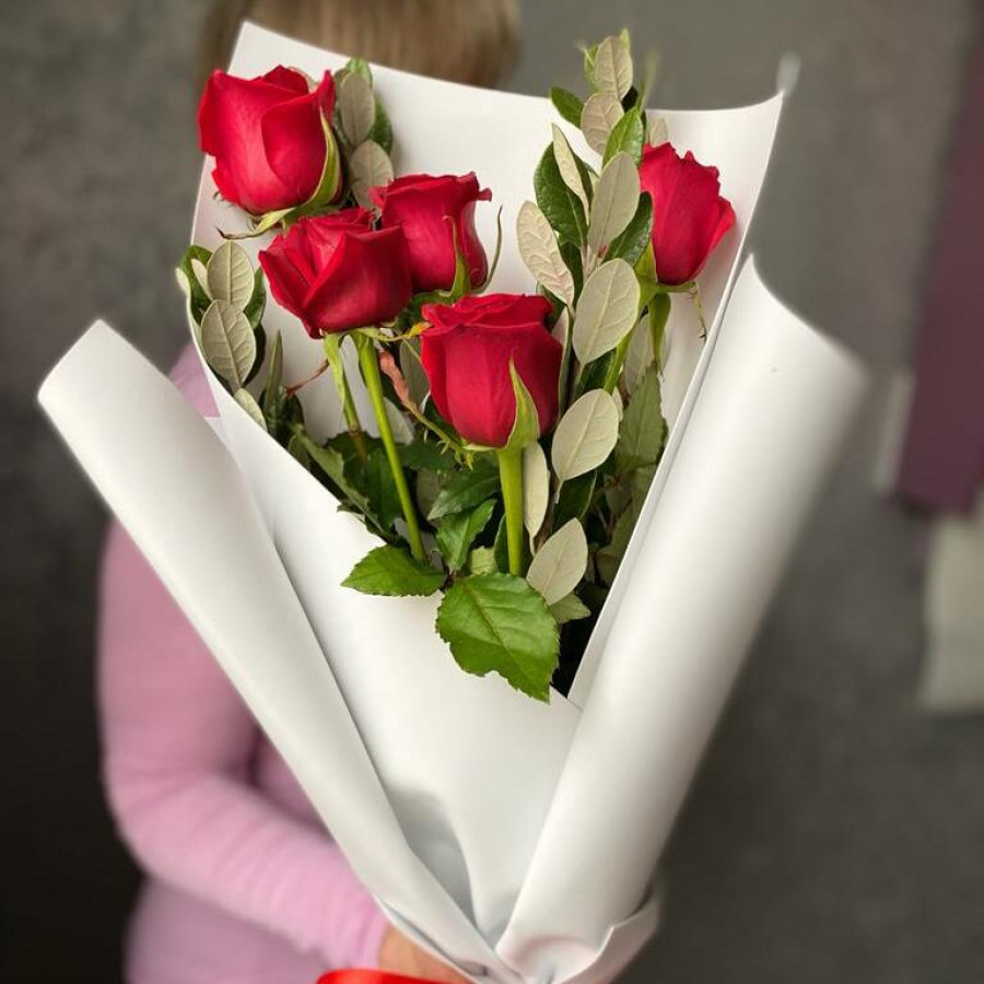 На фото букет из 5 красных роз. В составе: роза 5 шт, крафт-бумага 1 шт, атласная лента 1 шт, . Все цветы свежие и ароматные, букет красиво оформлен и отлично подходит для подарка. Доступна доставка цветов или самовывоз.