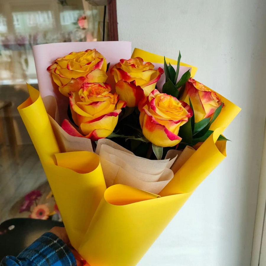 На фото букет из 5 желтых роз. В составе: роза 5 шт, крафт-бумага 1 шт, атласная лента 1 шт, . Все цветы свежие и ароматные, букет красиво оформлен и отлично подходит для подарка. Доступна доставка цветов или самовывоз.