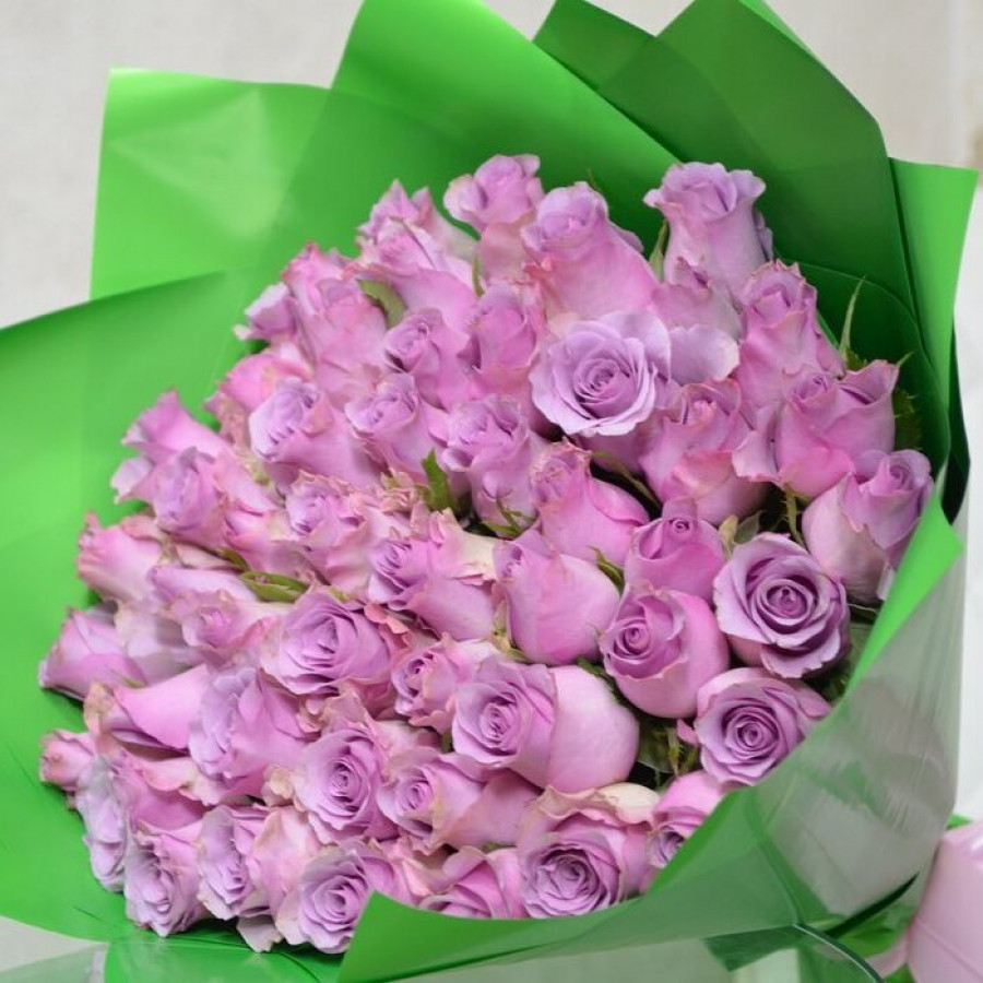 На фото букет из 51 сиреневой розы. В составе: роза 51 шт, крафт-бумага 1 шт, атласная лента 1 шт, . Все цветы свежие и ароматные, букет красиво оформлен и отлично подходит для подарка. Доступна доставка цветов или самовывоз.