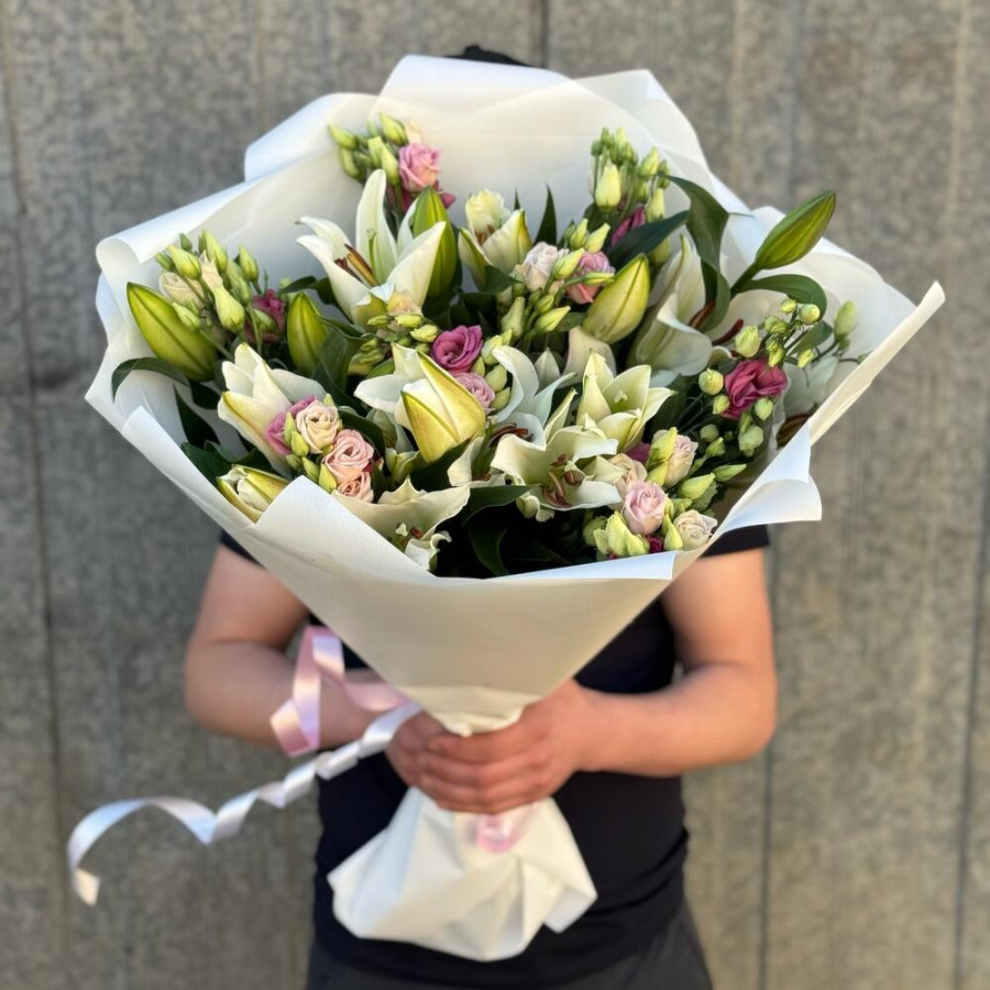 На фото букет из белых лилий и розовых эустом. В составе: эвкалипт 10 шт, лилия 10 шт, дизайнерская упаковка 2 шт, атласная лента 1 шт, . Все цветы свежие и ароматные, букет красиво оформлен и отлично подходит для подарка. Доступна доставка цветов или самовывоз.