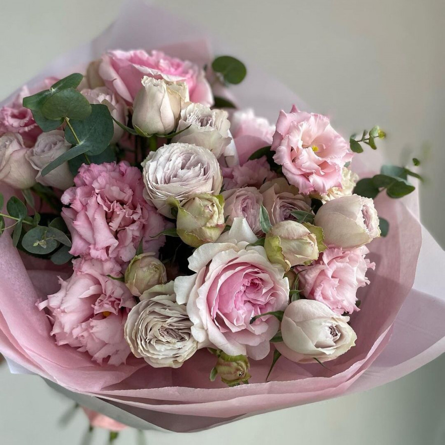 На фото букет из белых пионовидных роз. В составе: кустовая пионовидная роза 4 шт, эустома (лизиантус) 3 шт, роза 2 шт, эвкалипт 1 шт, крафт-бумага 1 шт, . Все цветы свежие и ароматные, букет красиво оформлен и отлично подходит для подарка. Доступна доставка цветов или самовывоз.