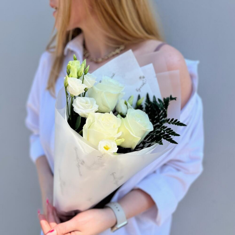 На фото букет из белых роз и эустомы. В составе: роза 3 шт, эустома (лизиантус) 1 шт, папоротник 1 шт, дизайнерская упаковка 1 шт, атласная лента 1 шт, . Все цветы свежие и ароматные, букет красиво оформлен и отлично подходит для подарка. Доступна доставка цветов или самовывоз.