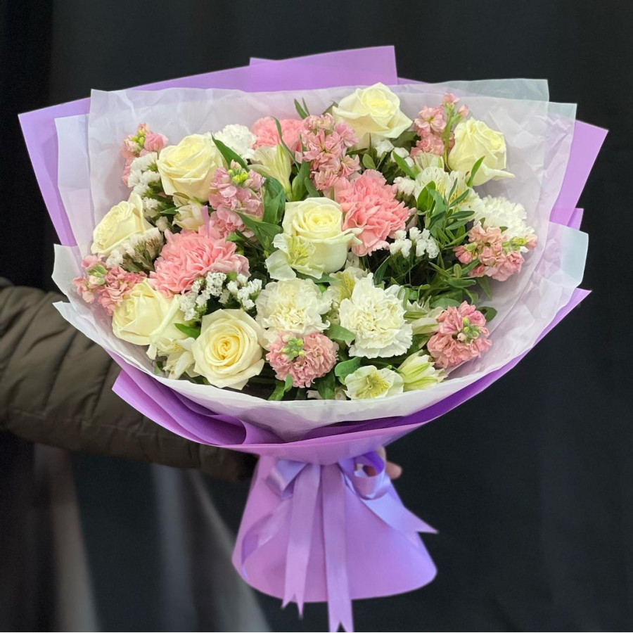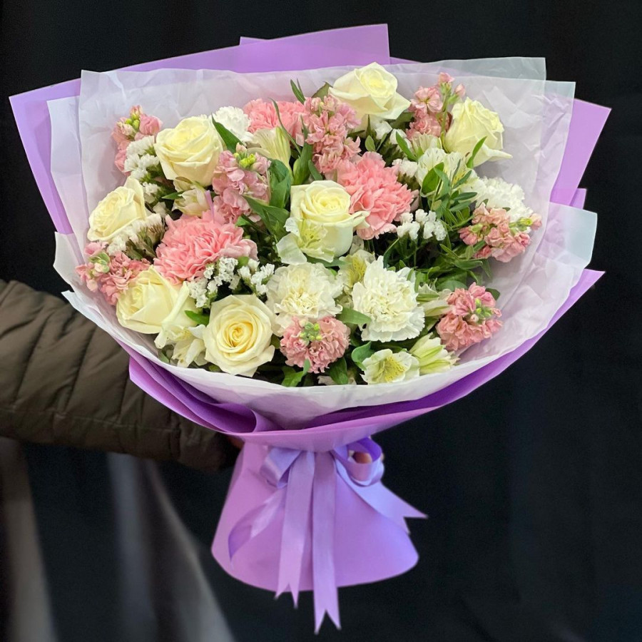 На фото букет из белых роз и гвоздик. В составе: роза 7 шт, гвоздика 11 шт, статица 5 шт, альстромерия 3 шт, крафт-бумага 1 шт, атласная лента 1 шт, . Все цветы свежие и ароматные, букет красиво оформлен и отлично подходит для подарка. Доступна доставка цветов или самовывоз.