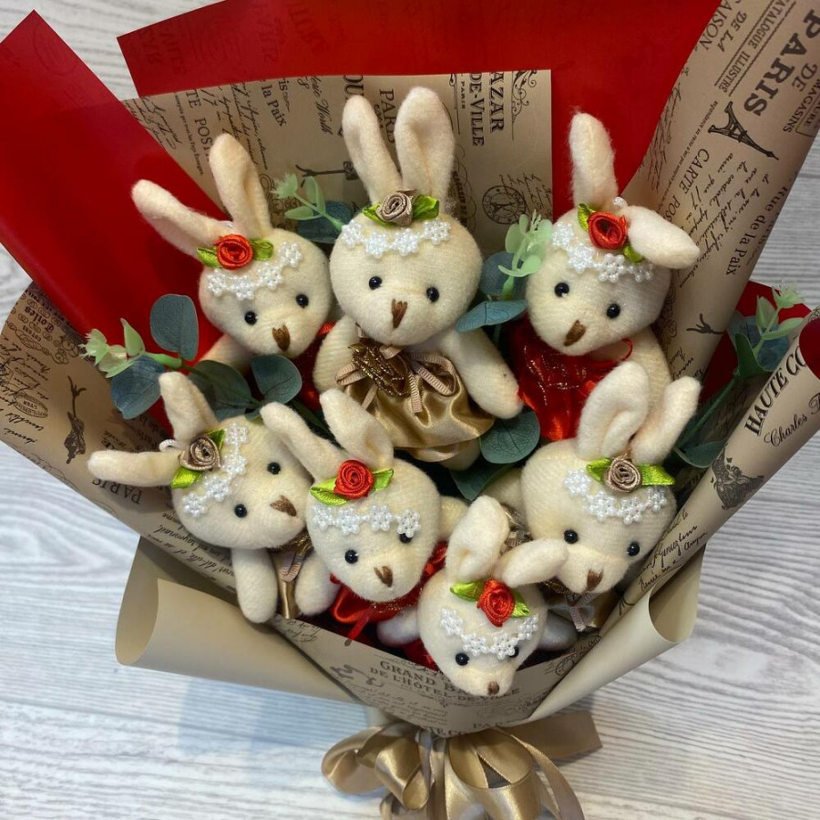 На фото букет из игрушек «зайки» 7 шт.. В составе: . Все цветы свежие и ароматные, букет красиво оформлен и отлично подходит для подарка. Доступна доставка цветов или самовывоз.
