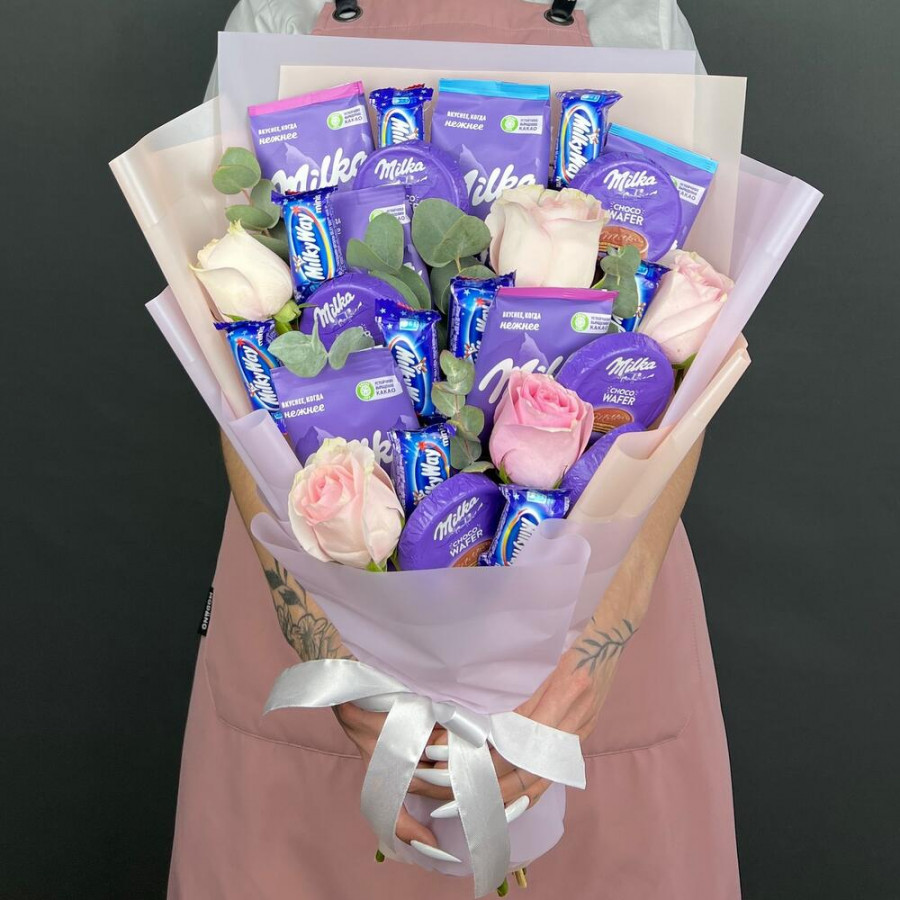 Букет из конфет Milka и розовые розы