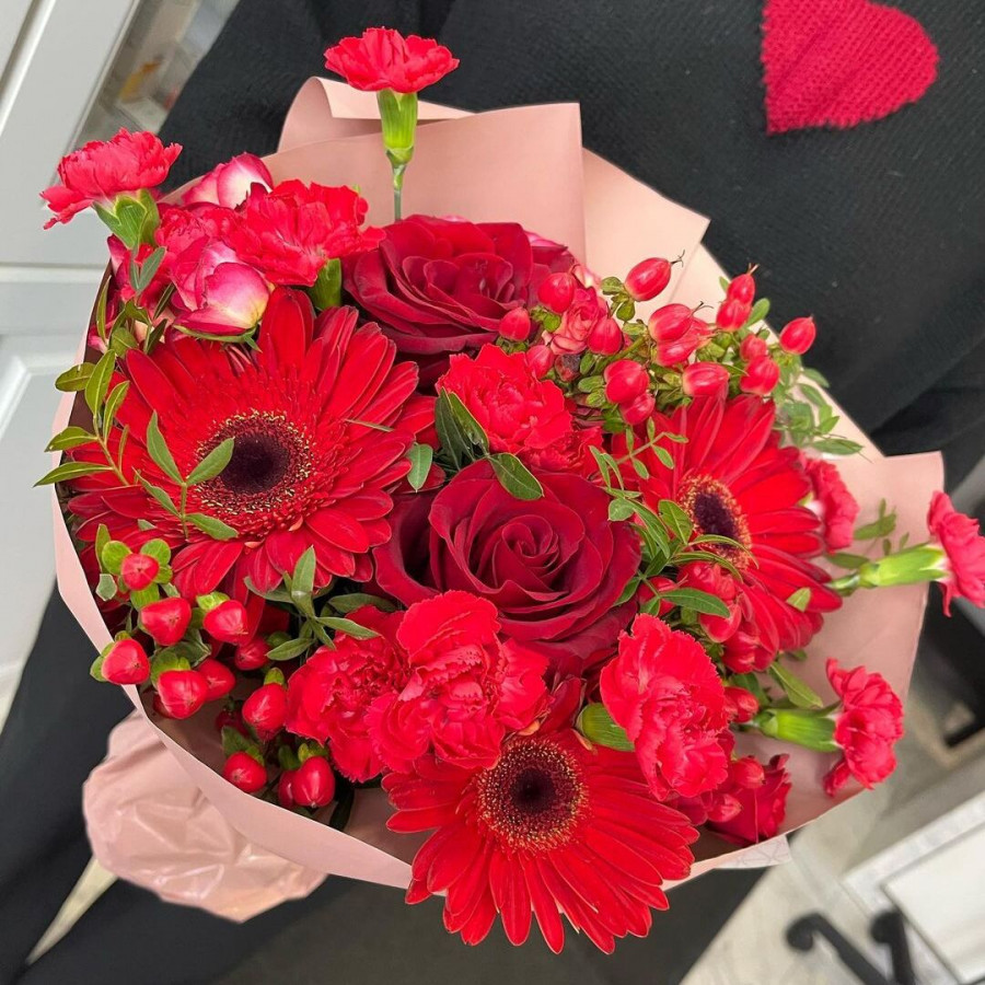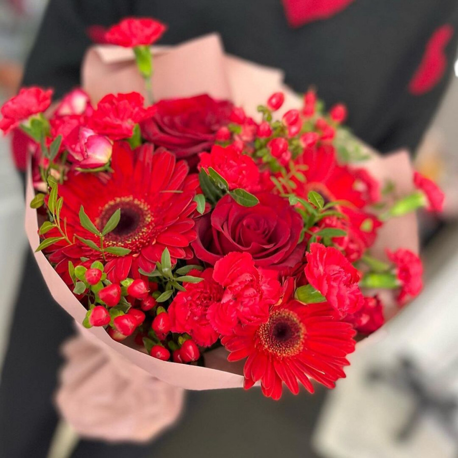 На фото букет из красных роз и гербер. В составе: гербера 3 шт, роза 2 шт, гвоздика 4 шт, гиперикум 2 шт, писташ 2 шт, крафт-бумага 1 шт, атласная лента 1 шт, . Все цветы свежие и ароматные, букет красиво оформлен и отлично подходит для подарка. Доступна доставка цветов или самовывоз.