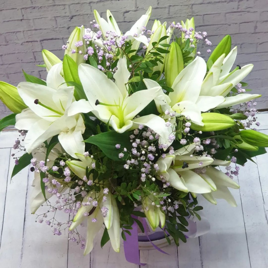 На фото букет из лилий и гипсофилы в коробке. В составе: лилия 7 шт, гипсофила 5 шт, шляпная коробка (m) 1 шт, атласная лента 1 шт, . Все цветы свежие и ароматные, букет красиво оформлен и отлично подходит для подарка. Доступна доставка цветов или самовывоз.