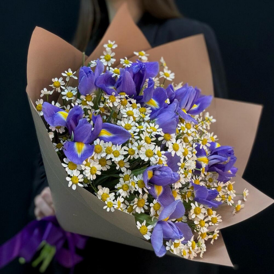 На фото букет из синих ирисов и танацетума. В составе: ирис 9 шт, танацетум 6 шт, крафт-бумага 1 шт, атласная лента 1 шт, . Все цветы свежие и ароматные, букет красиво оформлен и отлично подходит для подарка. Доступна доставка цветов или самовывоз.