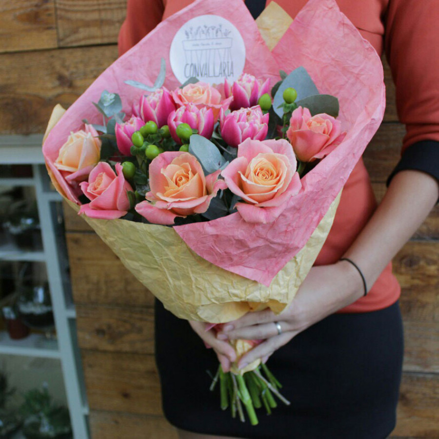 Сочетание эквадорских роз трендового цвета коралла и огненно-розовых тюльпанов в упаковке из тишью и крафта оттеняют зеленые ягодки гиперикума. Этот модный букет для самых изыскательных натур будет отличным поводом напомнить девушке, как Вы восхищаетесь ее красотой.