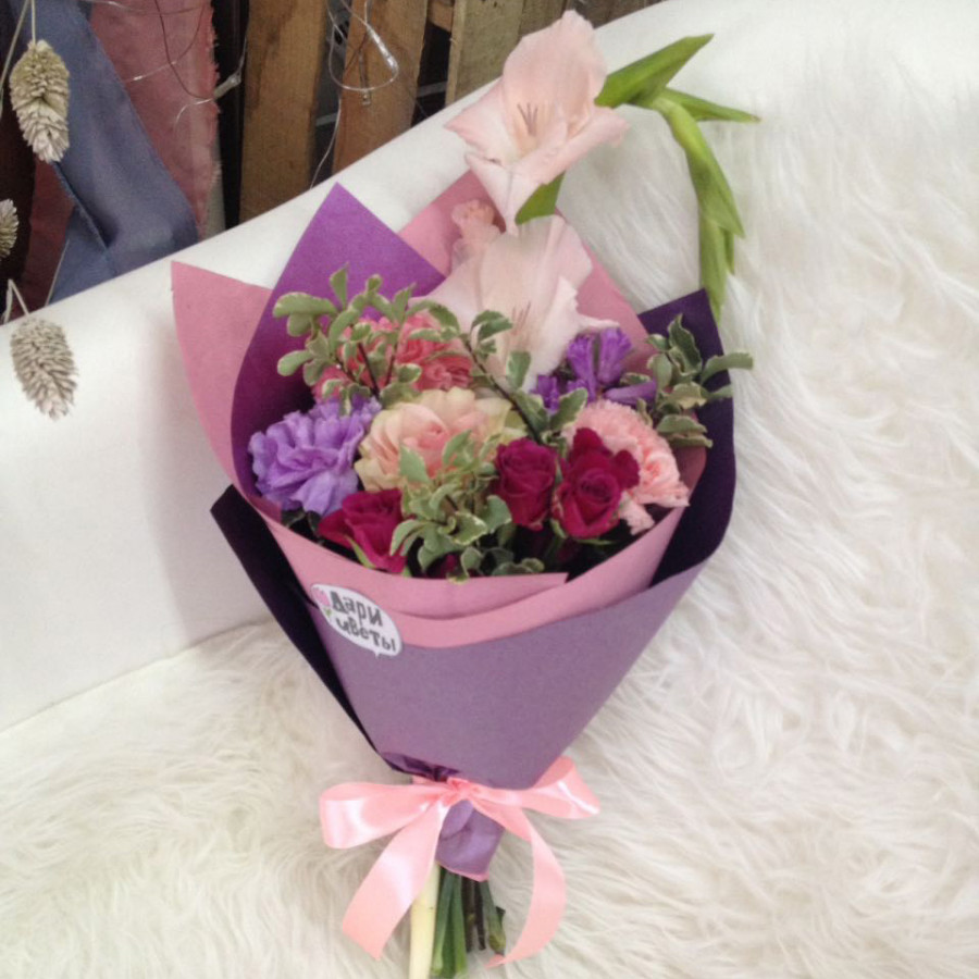 Небольшой букет с интересным сочетанием оттенков и цветов покорит сердце красавицы своими изящными кустовыми розочками, волнистыми лепестками гвоздики, цветком гладиолуса и ароматом весеннего ветра. Нежные оттенки и интересная упаковка придутся по вкусу изысканным избранницам.