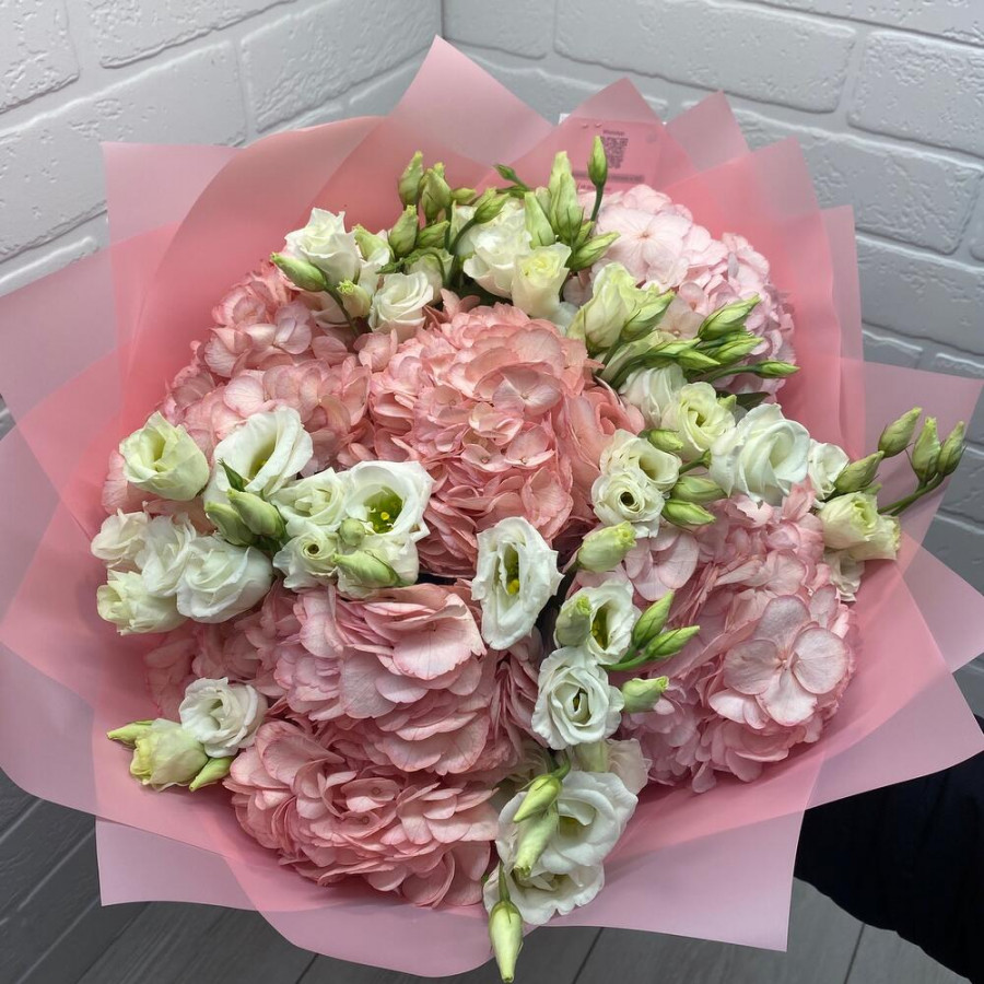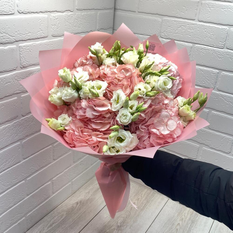 На фото букет из розовых гортензий и белых эустом. В составе: эустома (лизиантус) 7 шт, гортензия 5 шт, дизайнерская упаковка 1 шт, атласная лента 1 шт, . Все цветы свежие и ароматные, букет красиво оформлен и отлично подходит для подарка. Доступна доставка цветов или самовывоз.