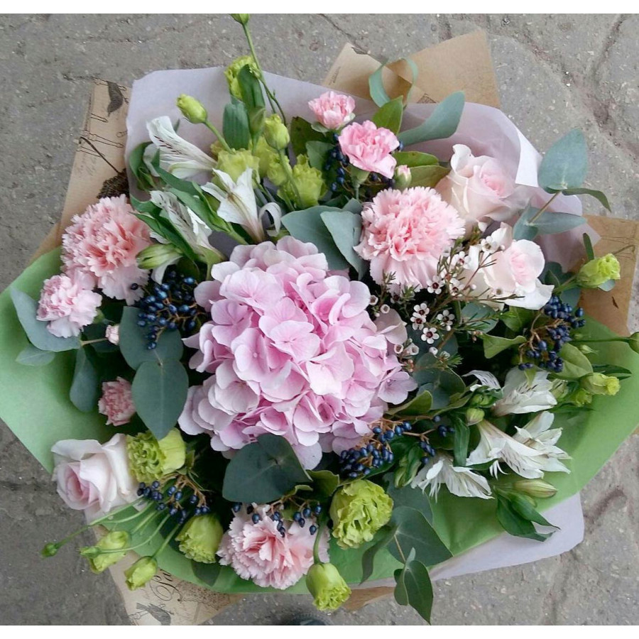 Нежный воздушный букет из розовой гортензии, гвоздик и роз, с веточками альстромерий и эустомы, свежими веточками эвкалипта и декоративными ягодками - это изящный подарок, который станет тонким намёком на Ваши глубокие искренние чувства. Утонченные лепестки цветов, ароматные бутоны и красота сочетаний оттенков восхитят получательницу и вскружат ей голову.
