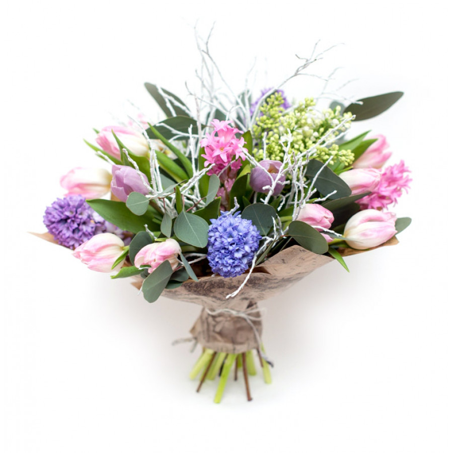 Свежайшие тюльпаны, дополненные прелестными и нежными  гиацинтами, украшенные веточкой сирени и листочками эвкалипта станут приятным напоминанием о теплых и солнечных весенних днях. Необычное декоративное оформление, стильная и оригинальная упаковка делают этот изысканный букет идеальным презентом для близких людей, коллег, сотрудников, позволяя в полной мере проявить всю Вашу любовь и уважение к ним.