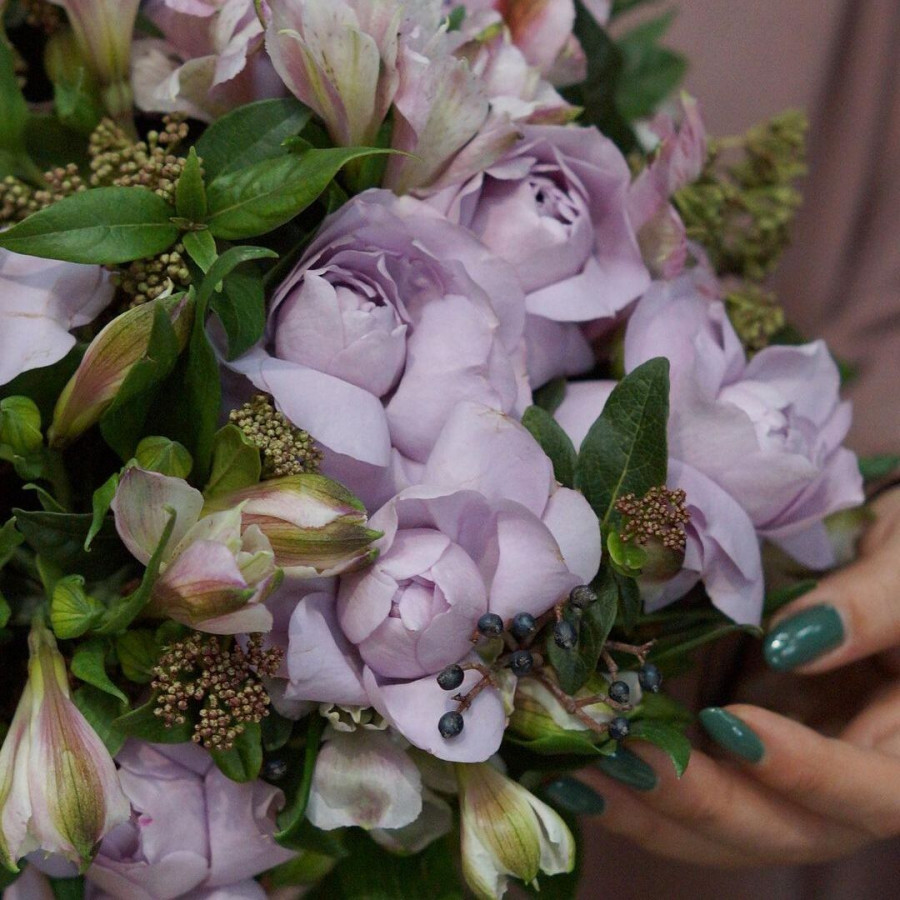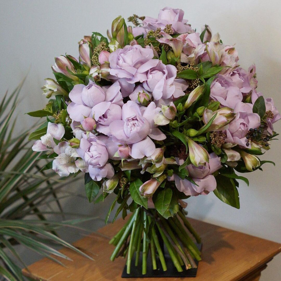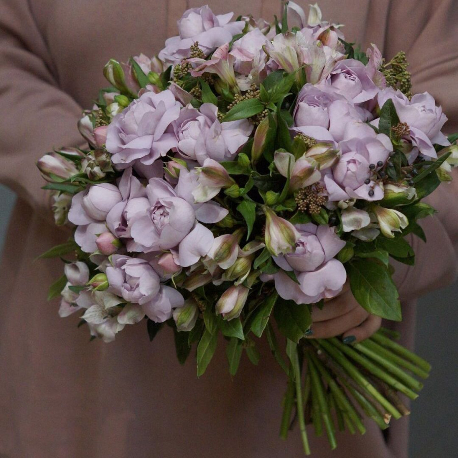 На фото европейский букет из кустовых роз. В составе: кустовая роза 15 шт, альстромерия 10 шт, атласная лента 1 шт, . Все цветы свежие и ароматные, букет красиво оформлен и отлично подходит для подарка. Доступна доставка цветов или самовывоз.