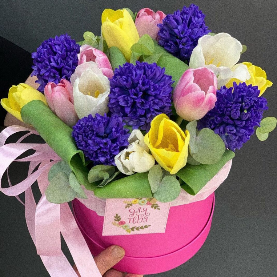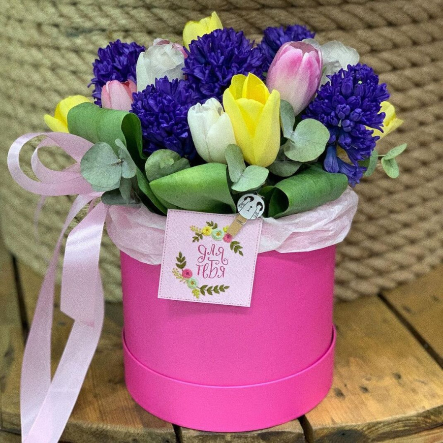 На фото гиацинты и тюльпаны в коробке. В составе: гиацинт 5 шт, тюльпан 11 шт, аспидистра 2 шт, шляпная коробка (s) 1 шт, атласная лента 1 шт, . Все цветы свежие и ароматные, букет красиво оформлен и отлично подходит для подарка. Доступна доставка цветов или самовывоз.