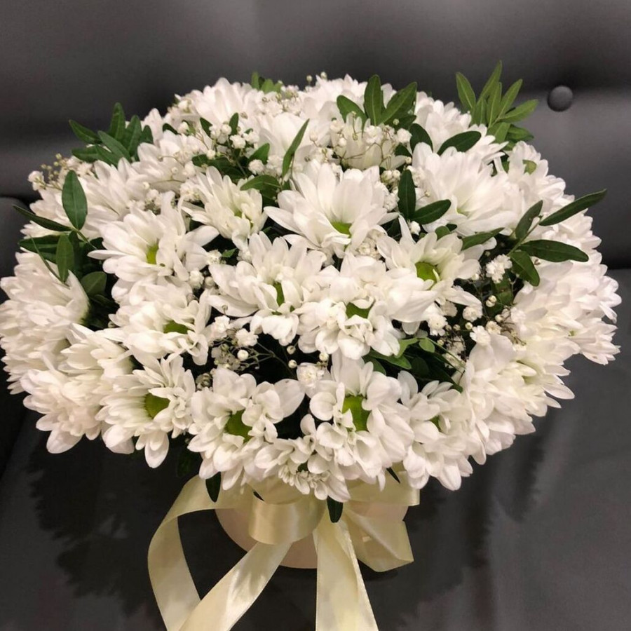 Хризантема белая и гипсофилы в коробке в Джанкое