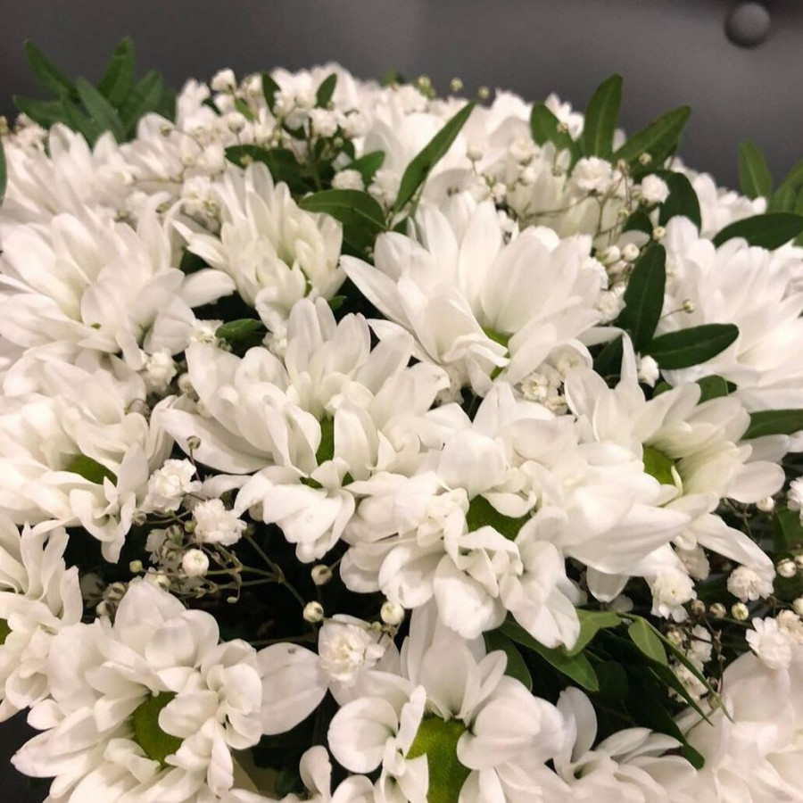 На фото хризантема белая и гипсофилы в коробке. В составе: хризантема кустовая 11 шт, гипсофила 5 шт, аспидистра 4 шт, коробка (m) 1 шт, бруния 1 шт, . Все цветы свежие и ароматные, букет красиво оформлен и отлично подходит для подарка. Доступна доставка цветов или самовывоз.
