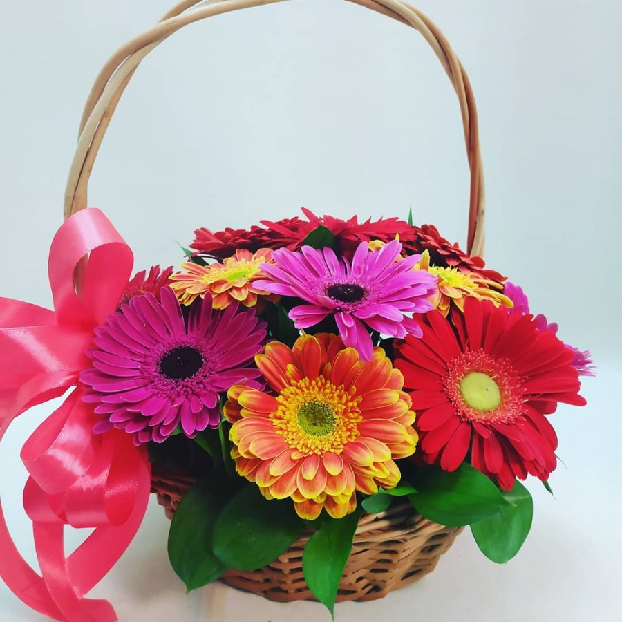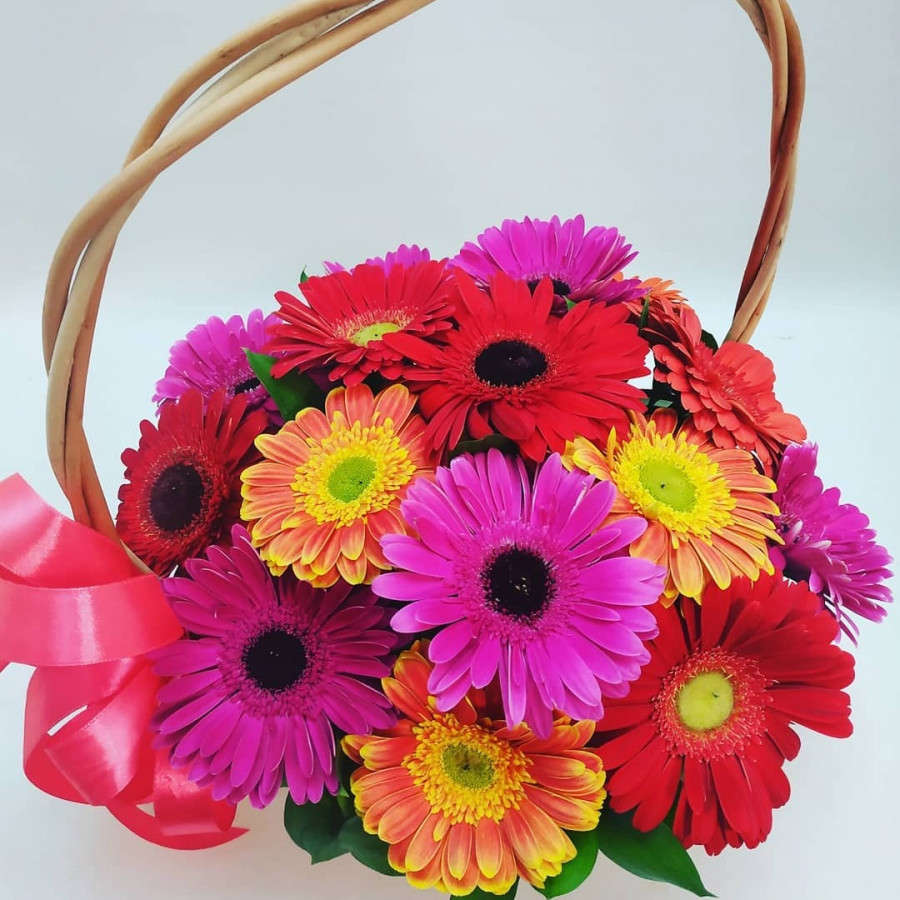 На фото композиция из 15 разноцветных гербер в корзине. В составе: гербера 15 шт, корзина (s) 1 шт, . Все цветы свежие и ароматные, букет красиво оформлен и отлично подходит для подарка. Доступна доставка цветов или самовывоз.