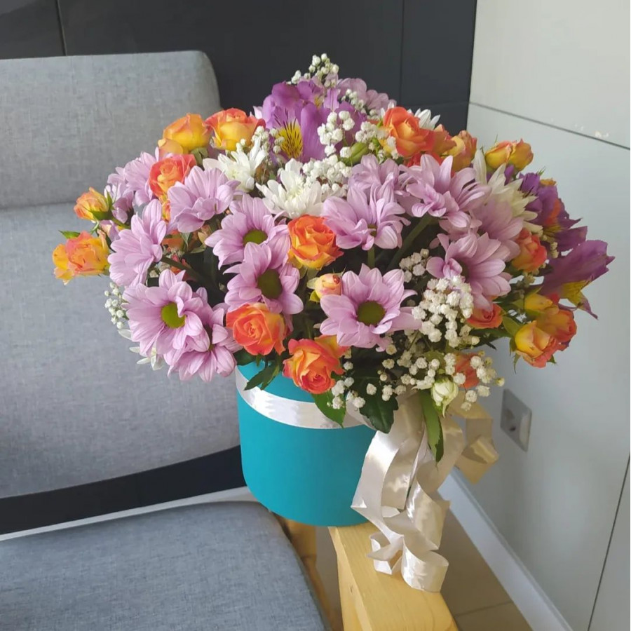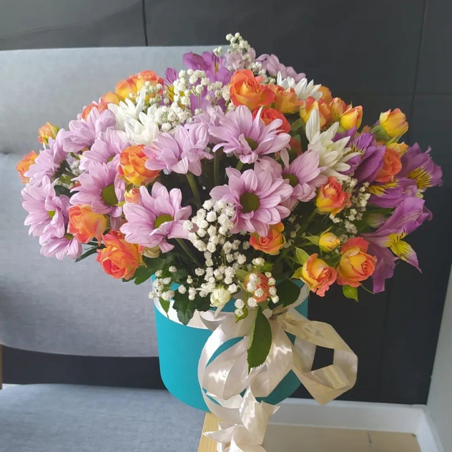 Яркая сборная композиция в круглой, шляпной коробке - бирюзового цвета из оранжевых кустовых роз, нежной розовой кустовой хризантемы и белой гипсофилы