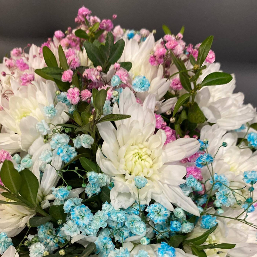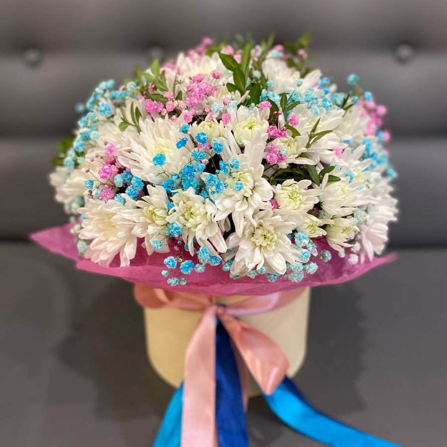 На фото коробка с хризантемами и гипсофилой. В составе: хризантема кустовая 8 шт, гипсофила 7 шт, писташ 4 шт, шляпная коробка (s) 1 шт, . Все цветы свежие и ароматные, букет красиво оформлен и отлично подходит для подарка. Доступна доставка цветов или самовывоз.