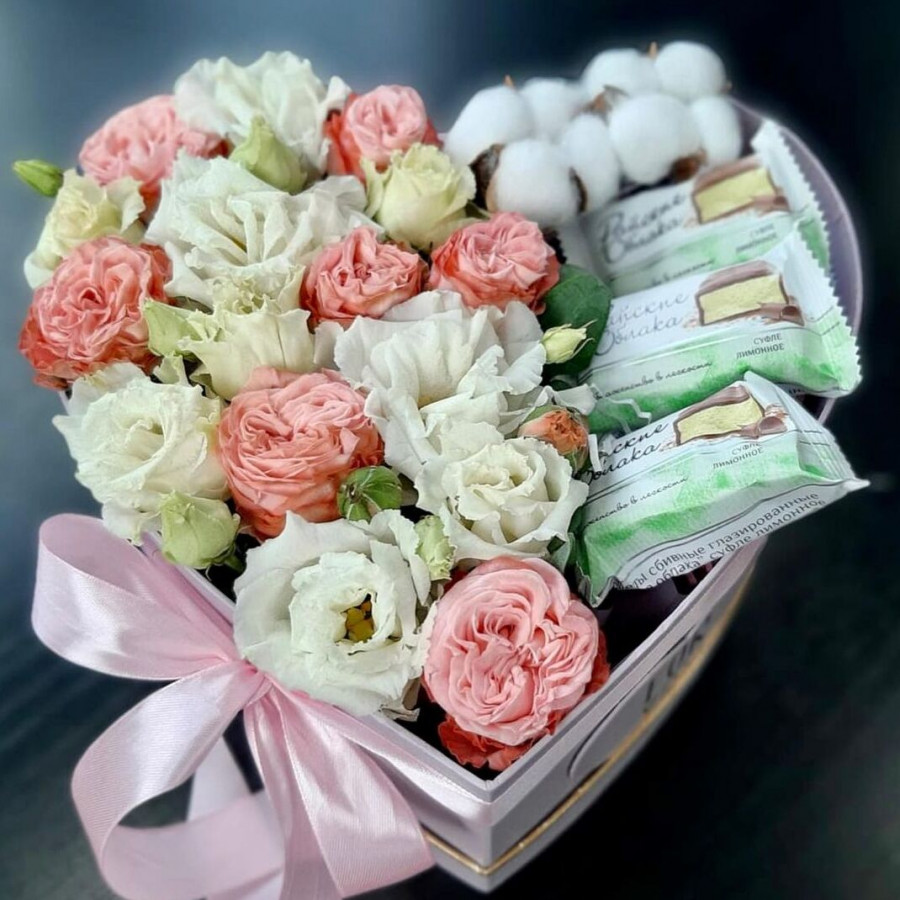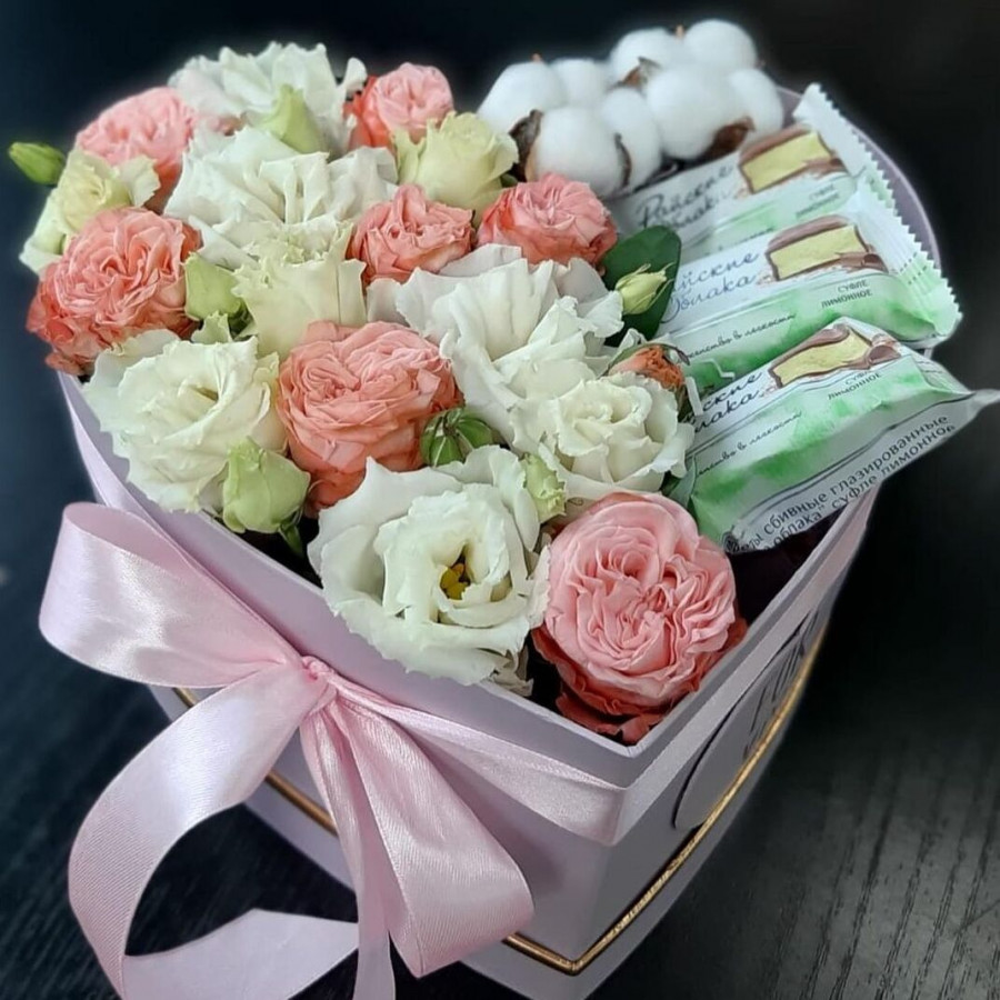 На фото коробка сердце с конфетами. В составе: кустовая пионовидная роза 2 шт, конфета 3 шт, эустома (лизиантус) 1 шт, хлопок 2 шт, коробка (s) 1 шт, . Все цветы свежие и ароматные, букет красиво оформлен и отлично подходит для подарка. Доступна доставка цветов или самовывоз.