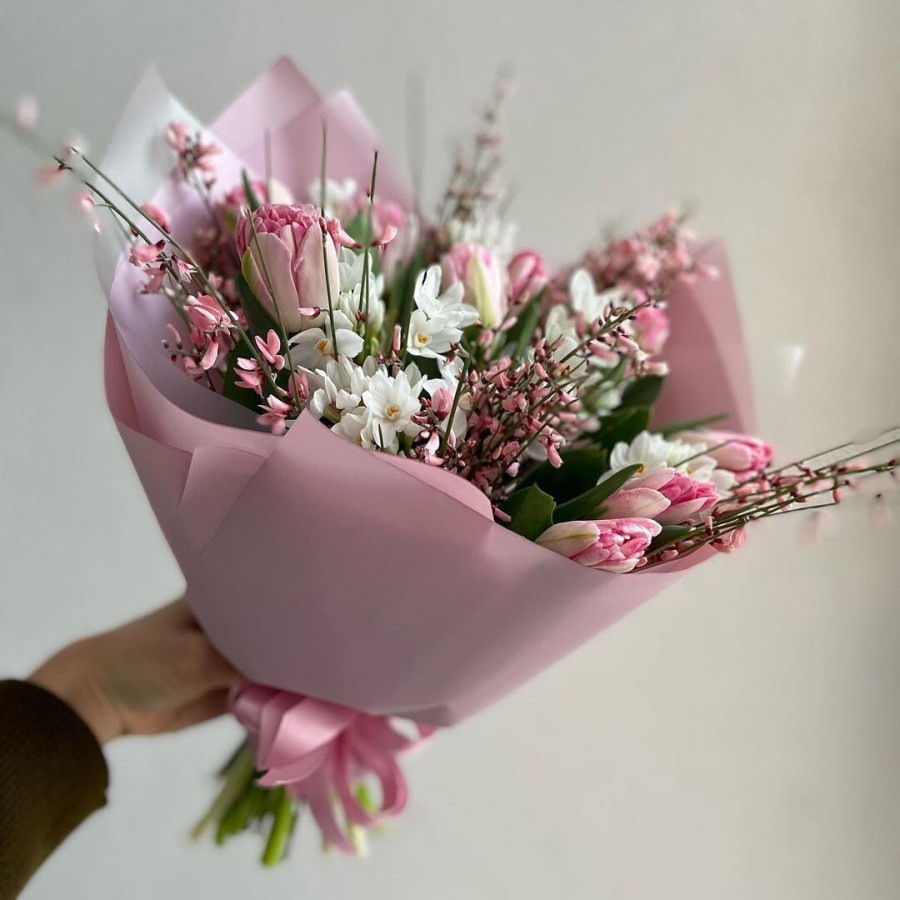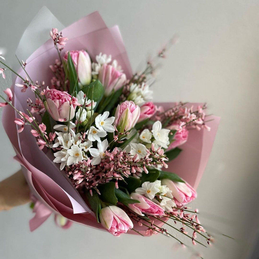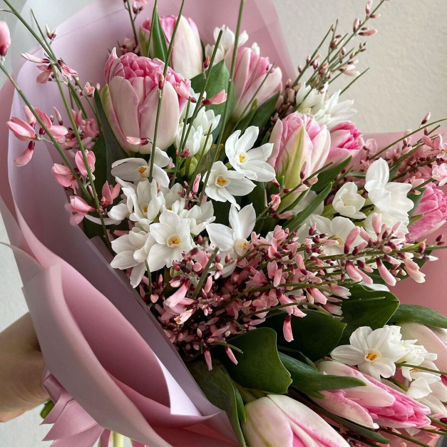 На фото тюльпаны и нарциссы. В составе: тюльпан 9 шт, нарцисс 5 шт, хамелациум 3 шт, крафт-бумага 1 шт, . Все цветы свежие и ароматные, букет красиво оформлен и отлично подходит для подарка. Доступна доставка цветов или самовывоз.